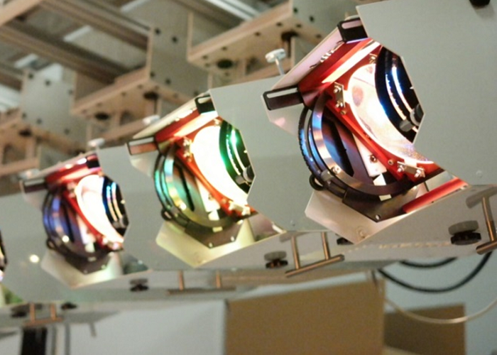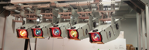 六個(gè)投影儀單元組件安裝在懸垂的架子上以進(jìn)行照明