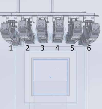 指向目標(biāo)平面的六個(gè)懸垂投影儀單元的機(jī)械圖